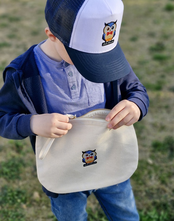 Fermeture zippée. Coton certifié par Control Union. Dragonne de 15cm.
